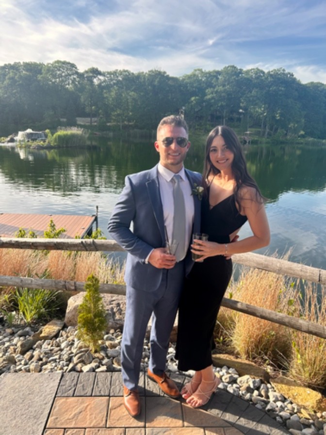Women can wear a formal full length dresses or cocktail dresses. Men can wear a formal suit of any color. (The tent wedding will be on grass, block heels are encouraged for women)